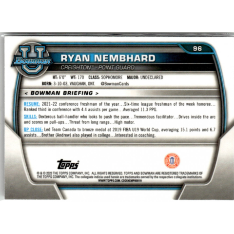 1 kép Topps 2022-23 Bowman Chrome University #96 Ryan Nembhard