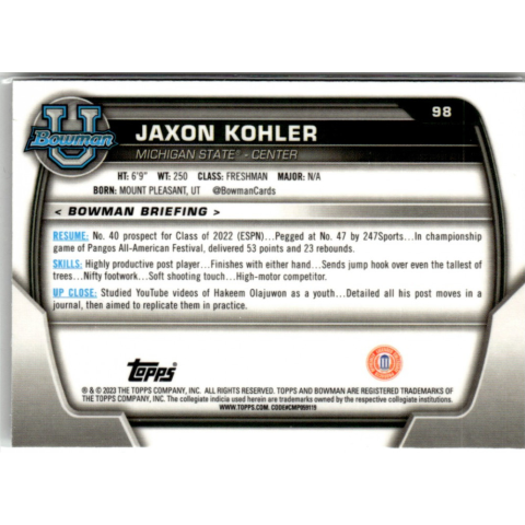 1 kép Topps 2022-23 Bowman Chrome University #98 Jaxon Kohler