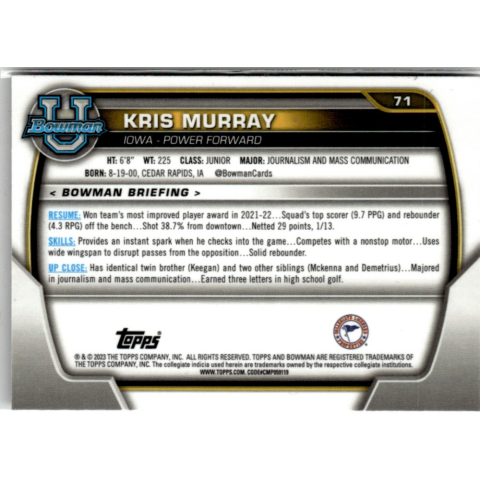 Az eladásra kínált 2022-23 Bowman Chrome University Shimmer Refractors #71 Kris Murray kosaras kártya NM-MT állapotban van. A kosaras kártyákat legtöbb esetben UP Platinum/Standard puha védőtokban és/vagy UP Toploader (kemény védőtok)-ben küldjük. Az