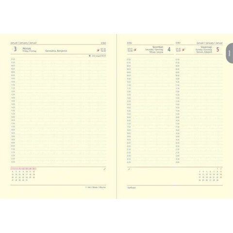 időbeosztás: félórás, 7-23.00 h kétféle, matt bőrhatású és eltérő felületű, hőre színeződő műbőr borító lapok 70 g, chamois papírból szürke-kék nyomat összesített naptár éves tervező havi előjegyző telfonregiszter/jegyzetoldalak vaknyomással és lézergrav