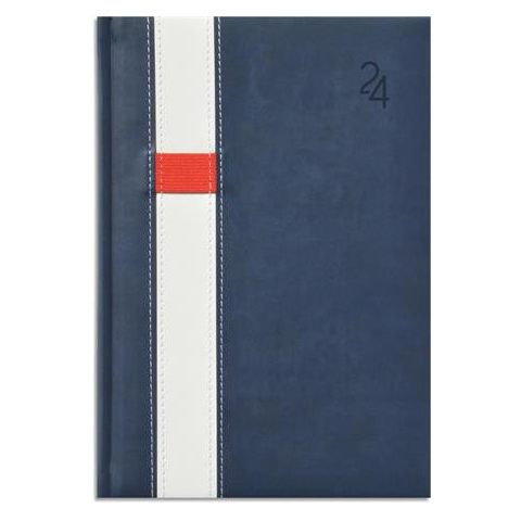 Naptár, tervező, B6, heti, TOPTIMER Vario, kék-fehér időbeosztás: félórás, 7-21.00 h műbőr bevonóval készült borító, présfólia felirattal és évszámmal lap típusa 70g, fehér ofszet jelzőszalaggal térképpel sarokperforációval szürke-kék nyomat havi elője