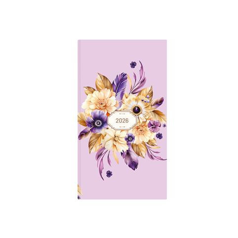 Színes grafikával díszített, matt fóliával bevont, fehér tömbös zsebnaptár, jelzőszalaggal.