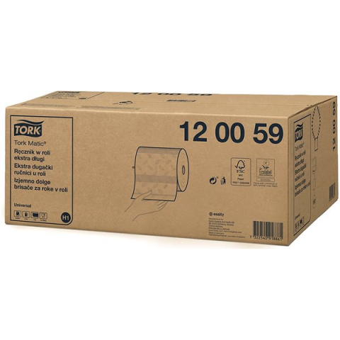 Kéztörlő papír - tekercs, kétrétegű kivitel, újrahasznosított és vízben lebomló, a tekercs hossza 280 m, átmérője 19 cm, fehér szín, 6 db csomag, 1120 kéztörlő csomagonként Jednovrstvé papírové ručníky v roli TORK Matic H1 z bílé celulózy skvěle slouží pro efektivní utírání rukou. Díky extra dlouhé roli s návinem 280 metrů umožňují méně časté doplňování a jsou vh