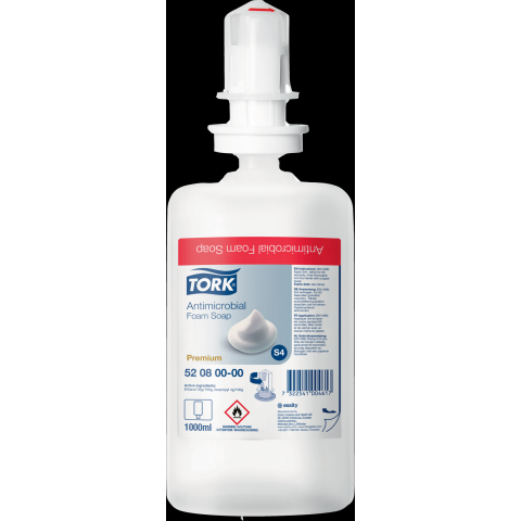 Tork 520800 fertőtlenítő habszappan, biocid hatású S4 Mosson kezet alaposan az EN 1499 tanúsítvánnyal rendelkező Tork fertőtlenítő habszappannal. Alacsony alkoholtartalmú összetétele hatékony a baktériumokkal, vírusokkal és élesztőgombákkal szemben. E