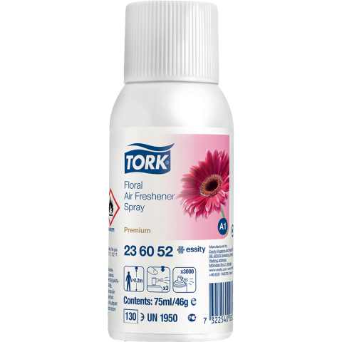 Tork 236052 adagolós illatosító spray A1 Kezelje eredményesen és hatékonyan a kellemetlen mosdóhelyi szagokat a Tork virágos illatosító spray-vel. A spray koncentrált illóolajat és saját fejlesztésű szagsemlegesítő anyagokat tartalmaz, így megszün