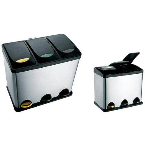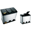 Szemetes - szelektált hulladékgyűjtéshez, űrtartalma 24 l, szabadon álló, anyaga fém, fekete és ezüst kivitel, nyitás pedállal, 3 tartály, kivehető belső tároló, méretek 41 x 46,5 × 31 cm (H×Sz×Mé) A Toro rozsdamentes acél burkolattal készült szemetes kosár a szelektív hulladékgyűjtés és tárolás profi segítője. A szemetes három kivehető műanyag tartályt rejt magában melyeknek a térfogata 8