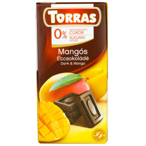 Torras mangós étcsokoládé hozzáadott cukor nélkül, édesítőszerrel Összetevők: édesítőszer: maltitol, kakaómassza, kakóvaj, alacsony zsírtartalmú kakaópor, liofilizált mangó (3%), inulin, emulgeálószer: napraforgó lecitin, természetes aromák: mangó és