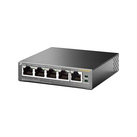 Switch otthoni használatra - desktop, unmanaged, 5× RJ-45, 5× 10/100Base-T, plug and play és PoE, priority mode, extended mode és PoE Auto recovery, 802,3af (PoE) és 802,3at (PoE+) támogatás, 4 PoE bemenet (PoE budget 67 W), 1 Gb/s váltókapacitás, 5 port 100 Mbit sebességgel, üzemi hőmérséklet 0 - 40 °C, mérete 98 × 99,8 × 25 mm (Ma×Sz×Mé) TP-Link TL-SF1005P switchEgyszerűen beállíthatóNégy port PoE-velKompatibilis az IEEE 802.3af protokollalTámogatja az IP-telefonok