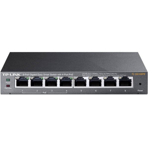 Switch otthoni használatra - smart, 8× RJ-45, 8× 10/100/1000Base-T, IGMP, Auto-MDI/MDIX, auto-negotiation és port tükrözés, QoS (Quality of Service), VLAN és statikus link-összevonás, PoE Auto recovery, 802,3af (PoE) és 802,3at (PoE+) támogatás, 4 PoE bemenet (PoE budget 64 W), 16 Gb/s váltókapacitás, 8 port 1 Gbit sebességgel, üzemi hőmérséklet 0 - 40 °C, mérete 25 × 158 × 101 mm (Ma×Sz×Mé) Switch TP-Link TL-SG108PEKifejezetten a kisvállalkozások igényeihez tervez