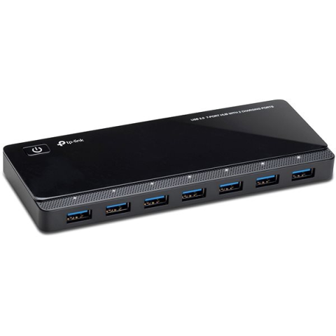 USB Hub - külső levehető és beépített USB tápkábellel, tápellátás USB-C csatlakozó segítségével, csatlakozás USB 3.2 Gen 1 (3.0) segítségével, 7× USB–A 3.2 Gen 1 (3.0), Gyors töltés támogatás, anyaga műanyag, fekete szín, méretei 1,75 × 6,55 × 16,5 cm (ma × szé × mé), csatlakozó kábel és adapter a csomagban USB rozbočovat TP-LINK UH720 tökéletes választás azok számára, akiknek szükségük van, hogy bővítse a számát USB port a számítógépen át