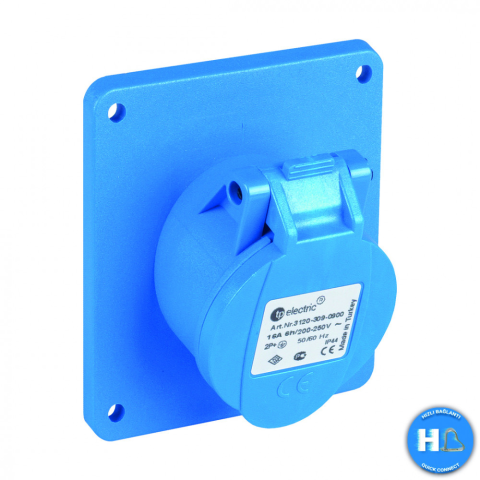 Beépíthető dugalj - Anyaga: műanyag - Méret: 90 x 83 mm - Beépítési méret: 82 x 72 mm - Névleges áram: 16A - Pólusok száma: 3P - (2P+E / 6h) - IP védettség: IP44 - Névleges feszültség: 220V - Típus: rugós - gyors bekötésű, ferde, csapfedeles beépíthető du