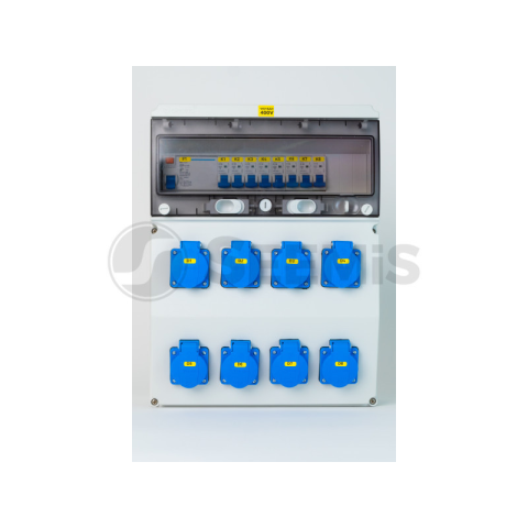 - 3360-as szerelt ipari doboz installációval, vezetékelve - Anyaga: műanyag - Méret: 300 x 400 mm - Előlapon: 8 x ( 2P+F) háztartási dugalj - Installáció: 8 x (1PC16A) kismegszakító - Installáció: 4P63A30mA Fí-relé - Érintésvédelmi osztály: II.Védelmi osz