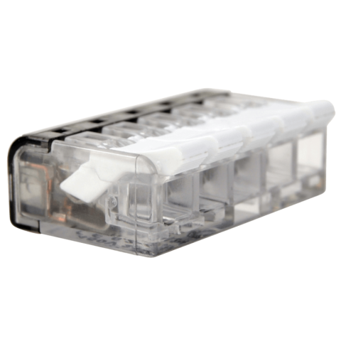TRACON CSAVAR NÉLKÜLI VEZETÉKÖSSZEKÖTŐ, NYITHATÓ ÁTLÁTSZÓ, 0,2-4mm2, 32A, 450VAC 5P Csavar nélküli vezetékösszekötő, nyitható átlátszó 0,2-4mm2, 32A, 450VAC 5P RVON5