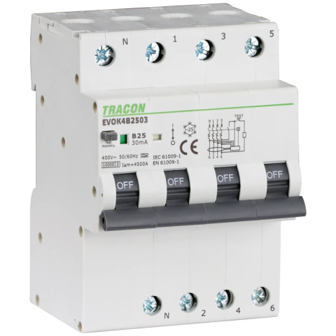 1 kép TRACON EVOK4B1603 Kombinált védőkapcsoló, 4P, 4modul, B karakterisztika B16A, 30 mA, 10kA, A