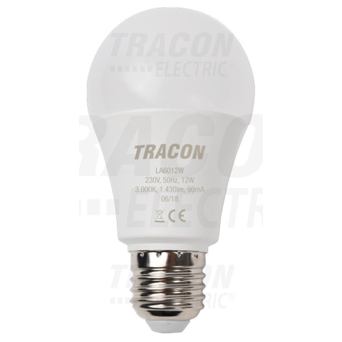 Gömb burájú LED fényforrás, 230VAC, 12 W, 3000 K, E27, 1430 lm, 200° LA6012W Tracon