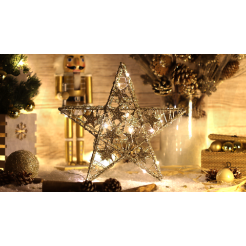 1 kép TRACON LED karácsonyi csillag, arany,fém, elemesTimer 6+18h, 14LED, 3000K, 2xAA