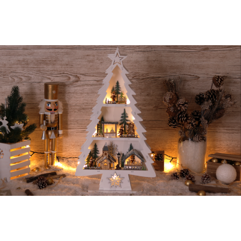 1 kép TRACON LED karácsonyi fenyő tájképpel, fehér, fa, elemesTimer 6+18h,13LED, 3000K, 2xAA