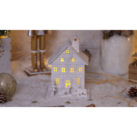 1 kép TRACON LED karácsonyi házikó, fa, fehér, elemesTimer 6+18h,2LED, 3000K, 2xAA