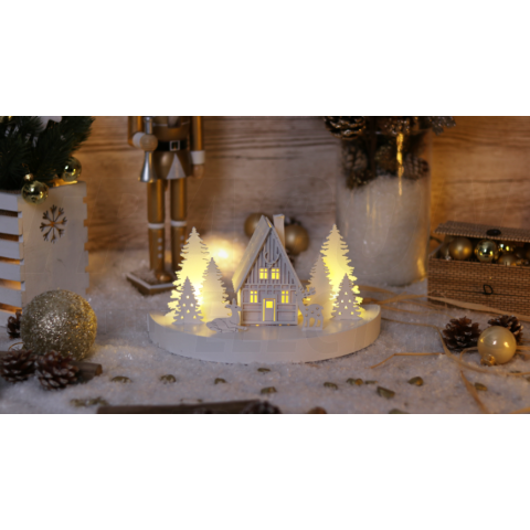 1 kép TRACON LED karácsonyi házikó, fa, fehér, elemesTimer 6+18h,6LED, 3000K, 3xAA