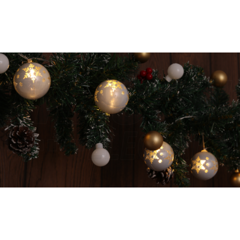 1 kép    TRACON LED karácsonyi lánc, gömb, hópehely, fehér, elemesTimer 6+18h,10LED, 3000K, 2xAA