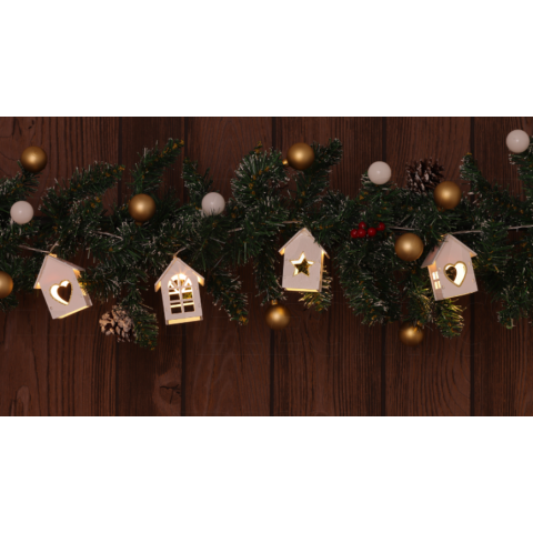 1 kép    TRACON LED karácsonyi lánc, házikó, fehér, fa, elemesTimer 6+18h,10LED, 3000K, 2xAA