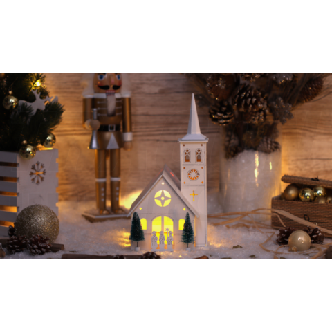 1 kép TRACON LED karácsonyi templom, fa, fehér, elemesTimer 6+18h,4LED, 3000K, 3xAA