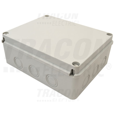 Tracon MED25209 műanyag falon kivüli kötődoboz 250x200x90 teli fedéllel, kikönnyített kábelbevezőtel, IP67 világosszürke Szerelési mód: fali/mennyezeti szerelés Hosszúság: 200 mm Szélesség: 250 mm Mélység: 90 mm Bevezetések száma: 10 Szekrényátvezetés típ