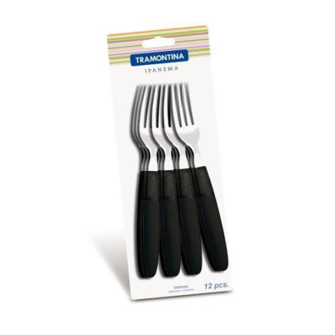 Mindennapi használatra kiválóan alkalmas villa készlet. A villák fogantyúja poliprolilénből készült, a villák rozsdamentes acélból. Mosogatógépben moshatók. A készlet 12 db villát tartalmaz, fekete fogantyúval. Brazil termék.