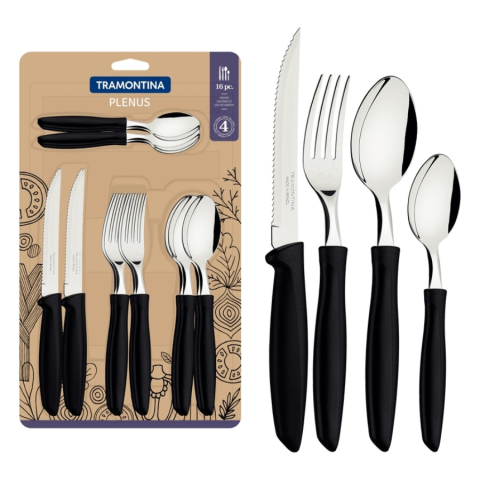 Tramontina Evõeszköz készlet 16 db-os mûanyag + acél Plenus 23498/001 - Anyaga: mûanyag nyél, rozsdamentes acél penge - A pengék a hõkezelésnek köszönhetõen rendkívül tartós vágóéllel rendelkeznek - A szett tartalma: 4 db steak kés, 4 db evõkanál, 4 db evõ villa, 4 db kávéskanál - Mosogatógépben mosható