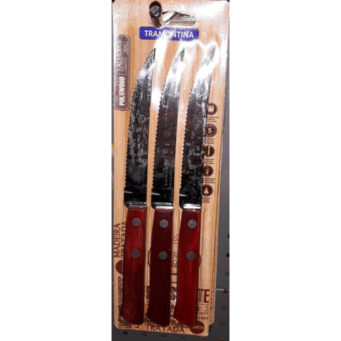 3 darabos rozsdamentes kés szett, szegecselt ergonómikus fa nyéllel. Hossza: 12 cm. Brazil termék.