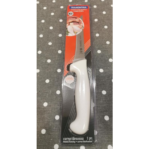 Rozsdamentes acél pengéjű csontozó kés, penge hossza: 12 cm. A markolata fehér színű műanyag, ergonómikus kialakítással.