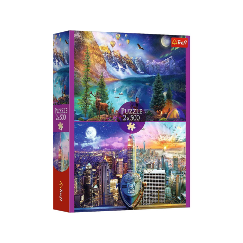 Az Amerikai körút 2x500 darabos puzzle különleges utazásra hív, hogy felfedezd Észak-Amerika két ikonikus helyszínét: a vadregényes természetet és a nyüzsgő nagyvárosi látképet. A szett két különböző, 500 darabos kirakót tartalmaz, így kétszer annyi élményt nyújt. Az egyik puzzle a természet csodáit ábrázolja egy lenyűgöző tavaszi vagy nyári tájon, ahol magas he
