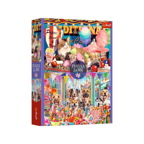 Az Édesszájú állatok 2x500 db-os puzzle szett két aranyos és vidám képet kínál, amelyek garantáltan mosolyt csalnak az arcodra. Az egyik kirakó egy cirmos macskákból álló cukrászcsapatot mutat be, akik vattacukor és pattogatott kukorica között heverésznek, míg a másik képen boldog kutyusok gyűltek össze egy édességbolt előtt, tele színes cukorkákkal és nyalókák