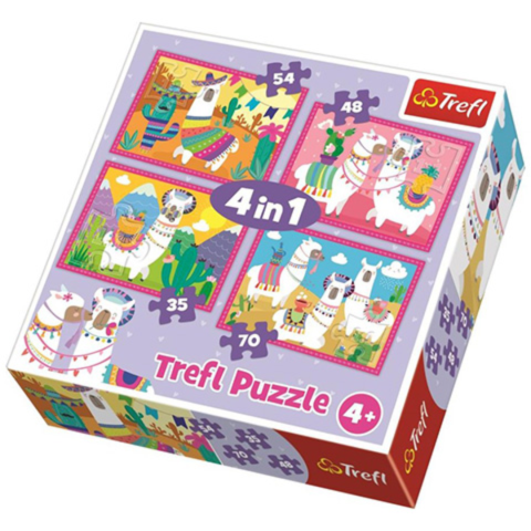 Gyermek puzzle Trefl négy képpel, vidám lámák motívumával.