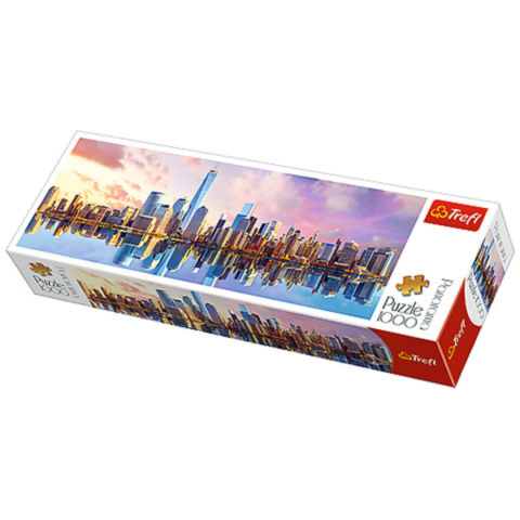 Manhatten csodálatos városképe ideális választás erre a panoráma puzzle kirakósra, hiszen a majd egy méter széles kép valódi panorámát eredményez a vízparti városról. Külön csodálatos, hogy a város felhőkarcolói tükröződnek a vízfelszínen, és az alacsonyan álló nap különleges színekre festi az eget. A Trefl puzzle darabok tökéletesen illeszkednek és a kompromi