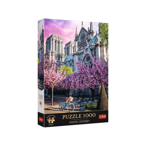 Éld át a párizsi tavasz varázsát ezzel a gyönyörű, 1000 darabos Notre Dame puzzléval! A Trefl puzzle nemcsak a híres katedrális építészeti csodáját ábrázolja, hanem egy bájos tavaszi jelenetet is, ahol a Notre Dame előtt álló cseresznyefák rózsaszín virágba borulnak, és egy hangulatos, kosaras bicikli várja az útjára indulókat. A háttérben látható katedr