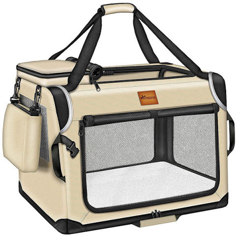 Přepravka pro psa a kočku, v balení lízací podložka, nosnost 18 kg, materiál polyester, kov, rozměr 70 × 52 × 52 cm (Š×V×H), vrchní a boční otevirání, větrací otvory, úložný prostor, skládací, do auta, otvory pro bezpečností pás, barva béžová Velmi praktická přepravka pro psy a kočky Tresko má vnitřní část vybavenou měkkou plyšovou dekou z fleece, která poskytuje mazlíčkovi pohodlné a útulné místo k odpočinku. Deku lze snadno odstranit a p