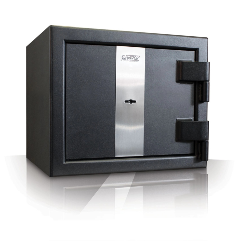 Magas biztonsági fokú, kicsi helyigényű bútorszéf. Duplafalú test és ajtó konstrukció. 6 mm vastag acél ajtólap, elegáns matt fekete festés, szálcsiszolt, rozsdamentes díszcsíkkal, mechanikus, kulcsos.
