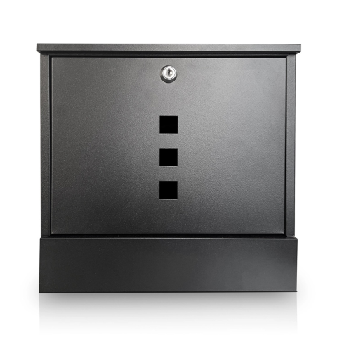 Kültéri postaláda, az alaptest matt fekete színű. Újságtartóval és felső bedobóval. A/4-es küldeményekhez méretezve.