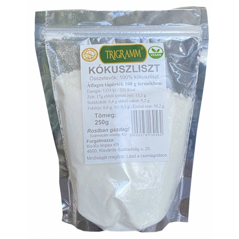 Trigramm kókuszliszt 250 g 100 % Kókuszliszt. Alacsony zsírtartalmú, finomszemcsés kókuszliszt, amely tökéletesen alkalmas édes, sós sütemények, illetve kenyerek készítéséhez. Gluténmentes termék, hozzáadott adalékanyagot, cukrot, ízfokozót, színezéket