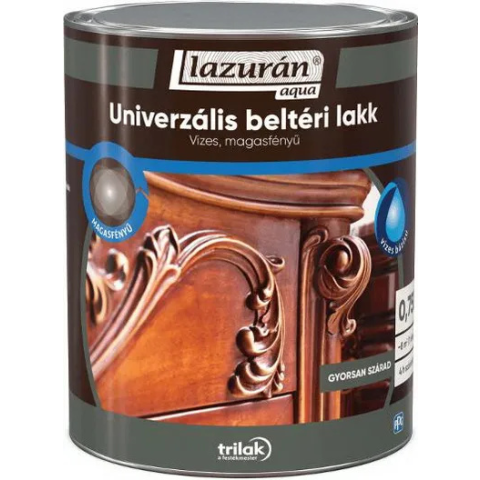 Lazurán Aqua Univerzális beltéri lakk magasfényű és selyemfényű változatban. A vizes bázisú lakk elsőroban bútorok, , illetve egyéb natúr vagy pácolt beltéri fafelületek (pl. lambériák , polcok, korlátok és egyéb használati tárgyak stb.) bevonataként alk