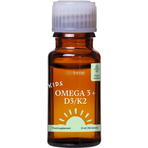 Omega 3 - Olaj, űrtartalma 31 ml, 68 mg EPA és 136 mg DHA, tartalma d-vitamin, k-vitamin és gyerek vitamin, alkalmas gyerekeknek, kismamáknak és szoptatós anyáknak Trime Kids Omega 3 + D3/K231 mlEgy okosan megtervezett keverék, amely a leggyakrabban hiányzó tápanyagokat - omega-3 (DHA, EPA) + D3- és K2-vitamin - tartalmazza, amelyek elengedhetetlenek a gyermekek