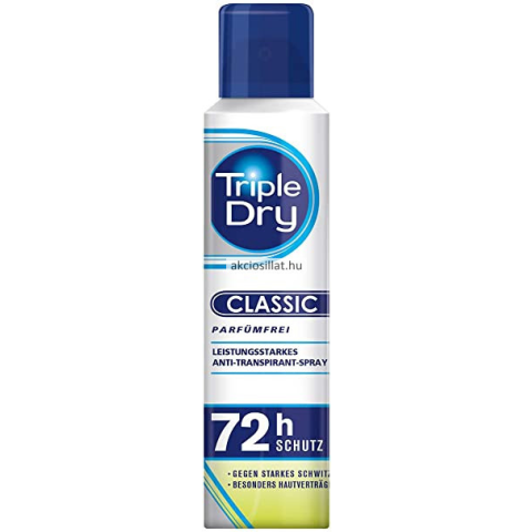 Triple Dry Izzadásgátló Dezodor - 150ml A Triple Dry izzadásgátló dezodor ideális választás mindazok számára, akik erős izzadás elleni hatékony és hosszú távú védelmet keresnek. Parfümmentes, antibakteriális formulája akár 72 órás védelmet biztosít, í
