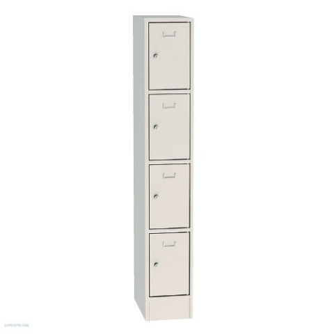 4 osztott ajtós értékmegőrző szekrény 150 mm magas teli lábazaton, rekeszenként címketartóval, szinterezett kivitelben. Főkulcsos rendszerű biztonsági hengerbetétes zárral, 2 kulccsal. A garancia feltétele a gyártói kiszállítás, amely Budapest területén