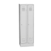 2 hosszúajtós fém öltözőszekrény rekeszenként polccal és akasztóval. 150 mm magas teli lábazaton álló, jobbra nyíló ajtós kivitel, szürke színben. 1 mm-es acéllemezből hajlítással és hegesztéssel gyártott. Szellőzőnyílások és címketartó az ajtón. Rekeszen