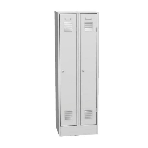 2 hosszúajtós fém öltözőszekrény rekeszenként polccal és akasztóval. 150 mm magas teli lábazaton álló, jobbra nyíló ajtós kivitel, szürke színben. 1 mm-es acéllemezből hajlítással és hegesztéssel gyártott. Szellőzőnyílások és címketartó az ajtón. Rekeszen