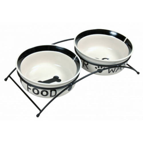 24642 - Trixie Eat on Feet állványos kerámia etetőkészletElegáns kerámia etető és itató, praktikus fém állványon. Az állvány porszórással festett, lábai végén gumi biztosítja a csúszásmentességet.Egy ilyen készlet nem csak jól mutat, de a kutya kényelmesebben képes enni belőle.A tálak kivehetőek, külön tisztíthatóak, akár mosogatógépben is.Átmérő: 20 cmŰrtartalom: 2 × 1.6 l