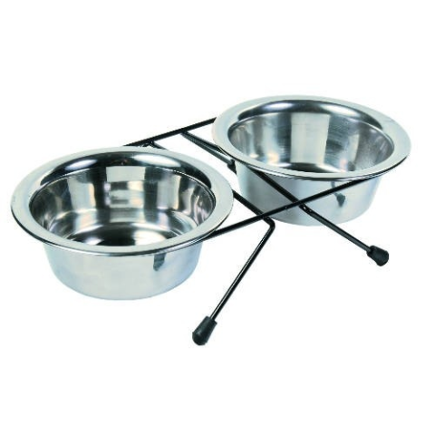 Fém Tál Szett (2x0,45l)  Két darab etetőtál és itatótál alacsony fém állvánnyal kutyáknak.   rozsdamentes 2 rozsdamentes acél tál állvánnyal porral bevont fémállvány, fekete csúszásmentes a gumi lábak miatt csere tálak: tétel 24840–24844  Méretek: 2 × 0,45 l / ø 12 cmTartalom: 2 db