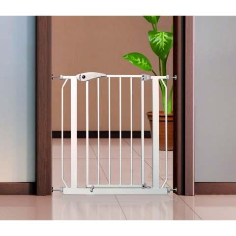 Elkerítő Aluminium Fehér (75-85x76cm) Trixie kiváló minőségű lakkozott alumínium, állítható hosszúságú, csúszásmentes gumi talpakkal ellátott határoló lakásba(ajtókba, lépcsőkhöz ajánlott), biztonsági zárral, kis és nagytestű, illetve kölyökkutyák számára is. Használatával elkerülhető, hogy a nem kívánatos helyekre menjek a kutyák. alkalmas nagy kutyáknál is fém, lakkozott egyszerű rögzítés 4 szorítókészülékkel (csavarozás nélkül, fur