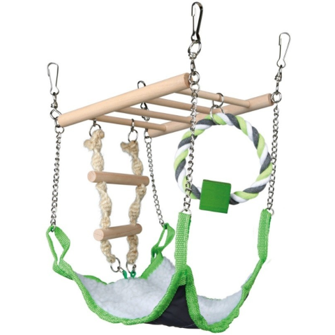 Fából készült létra, nylon függőággyal, játék létrával és kötélgyűrűvel. Ideális egereknek és hörcsögöknek.